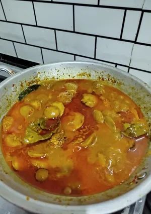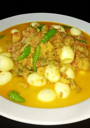 Enak parrahh, yukss dicoba. Bahan-bahan 1 kg Udang rebus secukupnya Telur puyuh rebus 1 buah Terong ungu potong kecil 1 pcs Santan instan 3 lembar Daun jeruk secukupnya Cabai rawit hijau secukupnya Air secukupnya Minyak goreng Bahan Bumbu Halus Diblender : 8 siung Bawang merah 3 siung Bawang putih 3 butir Kemiri 1/2 ruas Kunyit 1/2 cm Jahe 1 buah Tomat secukupnya Air Bumbu Tabur (Perasa) : secukupnya Gula pasir secukupnya Garam Kaldu ayam bubuk secukupnya (optional)