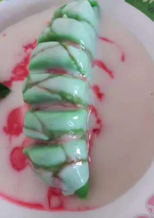 Bahan-bahan 10 buah pisang raja / lilit yang telah di kukus 200 gram tepung beras 250 gram tepung terigu 500 gram gula pasir 700 ml santan kental 200 ml air daun pandan yang sudah di parut dan di ambil airnya di campur oleh air matang secukupnya 2 sendok teh pasta pandan secukupnya Garam Bahan vla santan : 50 gram tepung beras 500 Ml santan kental 100 gram gula pasir Secukupnya garam Cara Membuat Kukus pisang dengan Kulit